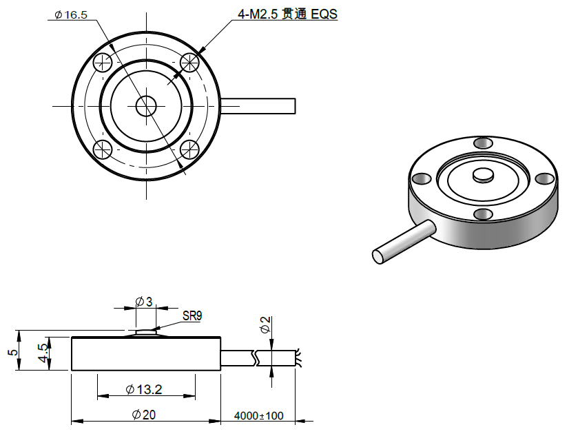 超薄設(shè)計、變形量小、外形尺寸小、量程大 | 50,100,200,500,1000N |